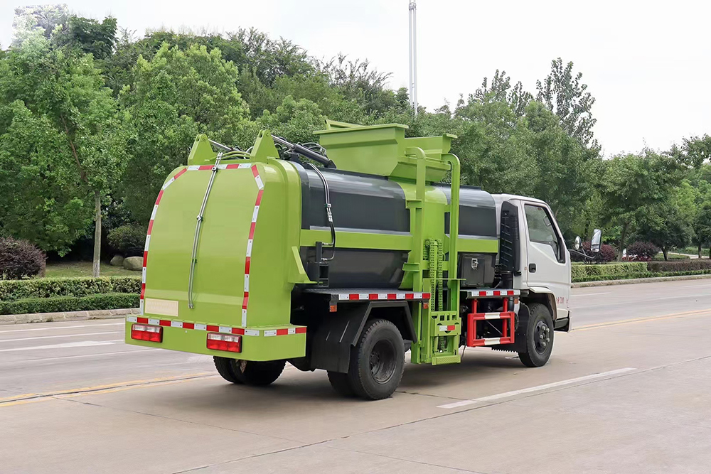 泔水装载由垃圾桶提升系统完成,该系统具有垃圾桶锁止结构,装卸安全可靠。垃圾桶与垃圾投入口衔接好,保证装卸过程中餐厨垃圾不溢撒、不遗漏。垃圾投入口与推板之间有足够距离,推板与罐体内表面设有密封装置,避免餐厨垃圾投入过程及分离过程中溢到推板后方。 液压系统由泵、液压阀和顺序阀以及各种功能的液压油缸、高低压管路组成。关键部件可选用原装进口,保证产品工作可靠、安全。