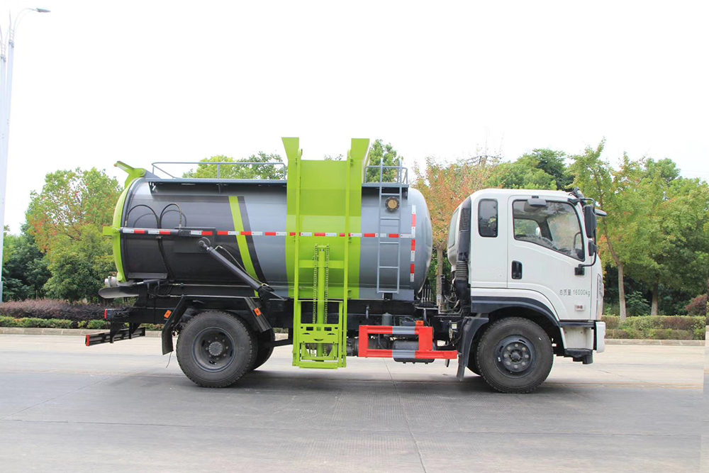 罐体采用优质碳钢板材,罐体内部选装带固液分离功能(全推推板,不锈钢泔水分离网板),选装罐内加热功能(用于严寒地带防止罐内餐饮垃圾冻结凝固,采用柴油燃烧机加热,加热速度快效果好,可设置高低温实现自动温控)。餐厨垃圾车带全液压操作系统,罐体举升自卸,拉杆式挂桶提升机,可以挂120/240升垃圾桶进行作业,后盖液压驱动开启、锁紧,方便人员操作。