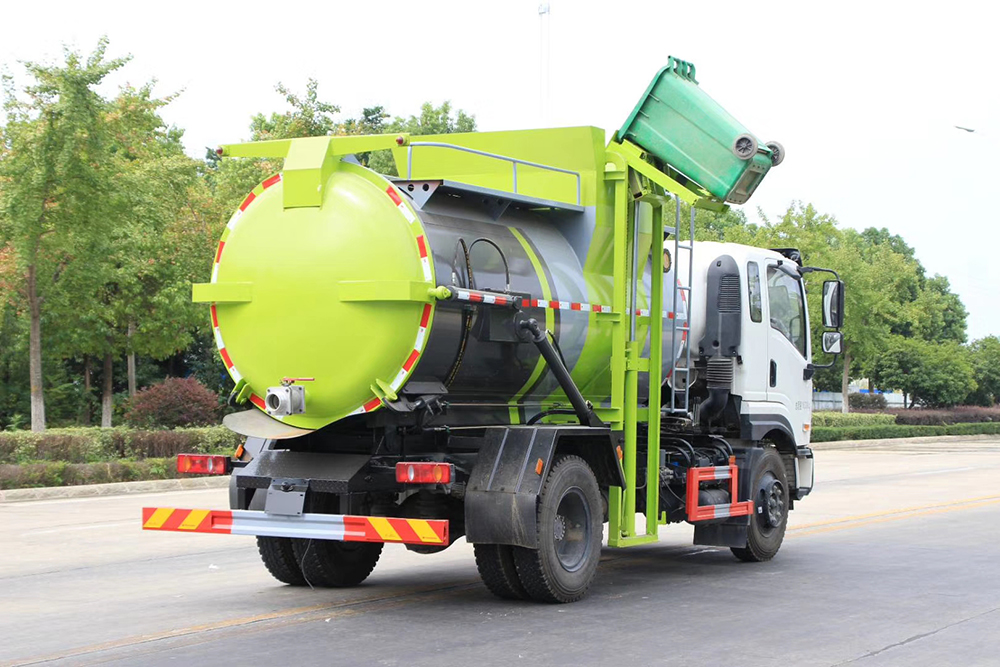 罐体采用优质碳钢板材,罐体内部带固液分离功能(全推推板,不锈钢泔水分离网板),罐内加热功能(用于严寒地带防止罐内餐饮垃圾冻结凝固,采用柴油燃烧机加热,加热速度快效果好,可设置高低温实现自动温控)全液压操作系统,工作人员操作方便,罐体举升自卸,拉杆式挂桶提升机,可以挂120/240升垃圾桶进行作业,后盖液压驱动开启、锁紧,方便人员操作。
